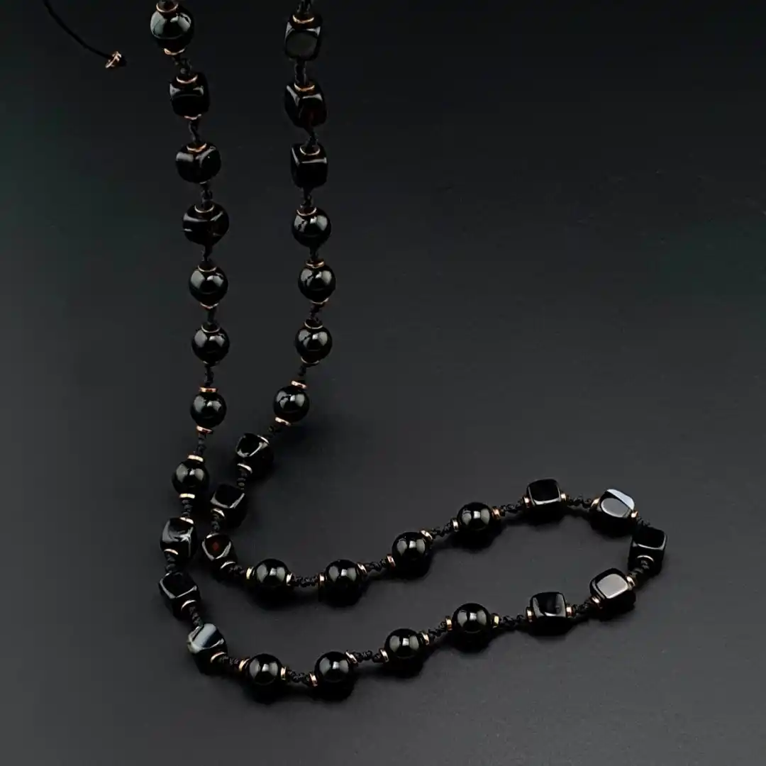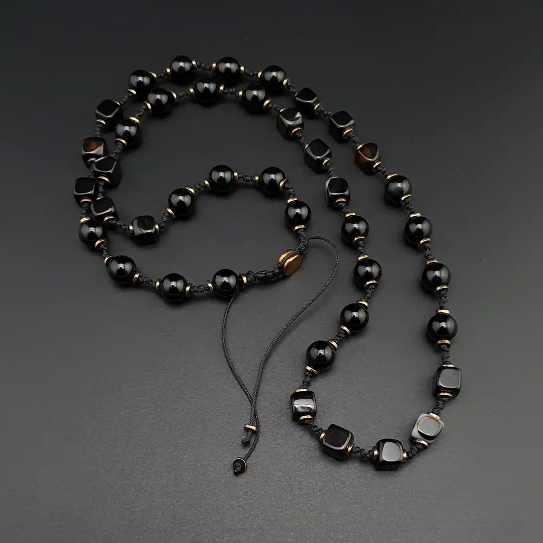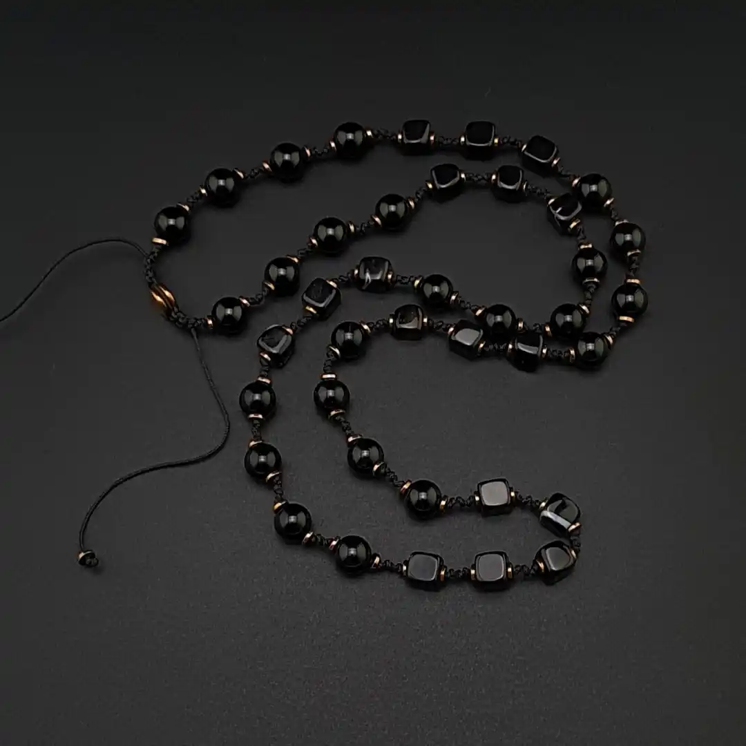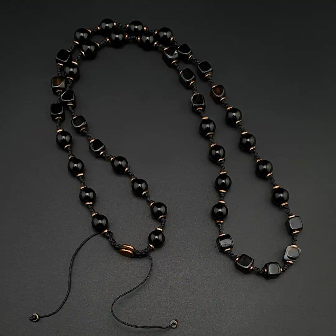 Doğal Taşların Estetik Uyumu İle Tasarlanan Bu El Yapımı Kolye, Akik Ve Hematit Taşlarının Dengeli Birleşimiyle Güçlü ve Zamansız Bir Stil Sunar. Farklı Taş Formları Ve Doğal Renk Geçişleri, Tasarıma Karakterli Bir Derinlik Kazandırır.