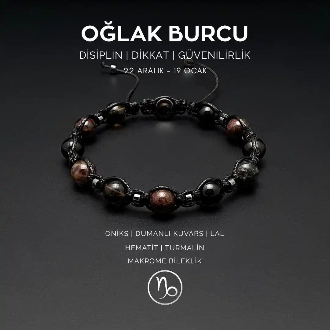 Disiplinli, kararlı ve güçlü yapısıyla öne çıkan Oğlak burcu için tasarlanan bu el yapımı makrome bileklik, zarif işçilik ve doğal taşların eşsiz uyumuyla hazırlanmıştır. Tasarımında yer alan oniks taşı, gücün ve dayanıklılığın sembolü olarak Oğlak’ın sağlam duruşunu vurgularken; dumanlı kuvars, negatif enerjiyi dönüştürerek içsel denge ve huzur sağlar. Lal (granat) tutkuyu, cesareti ve motivasyonu artırırken, hematit zihinsel netlik ve odaklanma kazandırır. Koruyucu etkisiyle bilinen turmalin taşı ise güven duygusunu pekiştirir ve dinginlik verir.