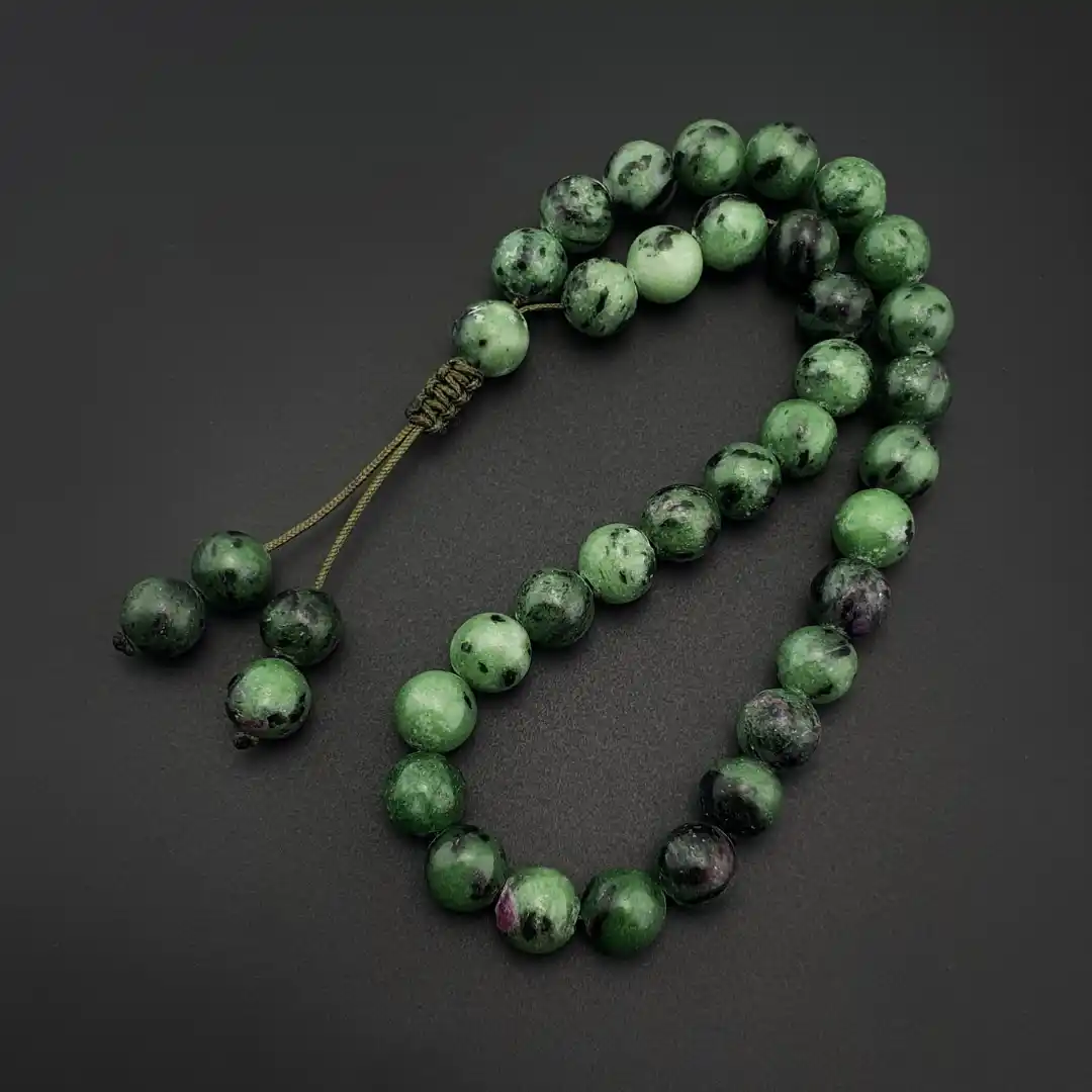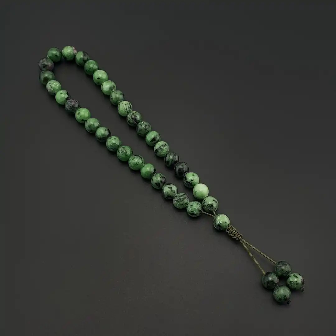 Dayanıklı tesbih ipi ile özenle dizilmiş olan model uzun ömürlü kullanım hedeflenerek hazırlanmıştır. İmame ve püskül detayları taşın doğal yeşil tonlarıyla uyumlu şekilde tasarlanmıştır.