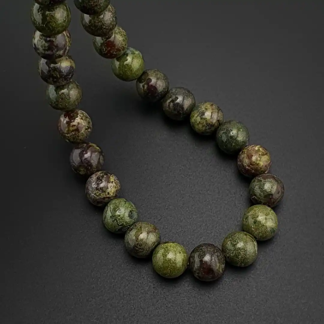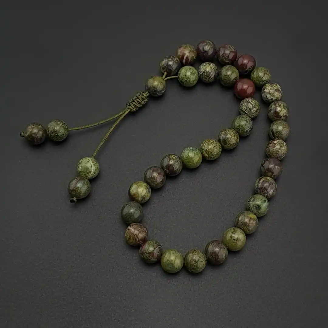 Doğal taş dünyasında koyu yeşil zemin üzerinde görülen kırmızı tonlu doğal desenleriyle dikkat çeken Kan Taşı (Bloodstone), kendine özgü görünümü sayesinde oldukça karakteristik bir estetik sunar. Taşın yüzeyinde görülen doğal desenler ve ton geçişleri, her taneyi benzersiz kılar ve tesbihe güçlü bir görsellik kazandırır.