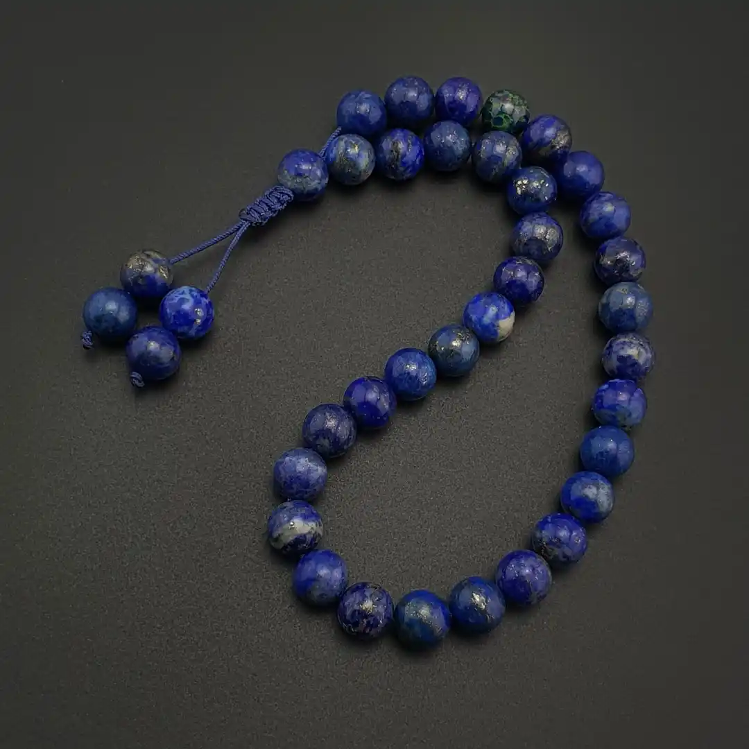 Doğal taş dünyasında derin ve etkileyici mavi tonlarıyla öne çıkan Lapis Lazuli, taş yüzeyindeki altın ve beyaz mineral yansımalarıyla tesbihe sofistike ve estetik bir karakter kazandırır. Her tanede görülen doğal renk geçişleri ve taş içindeki parlak noktalar, tesbihe benzersiz bir görsellik sunar.