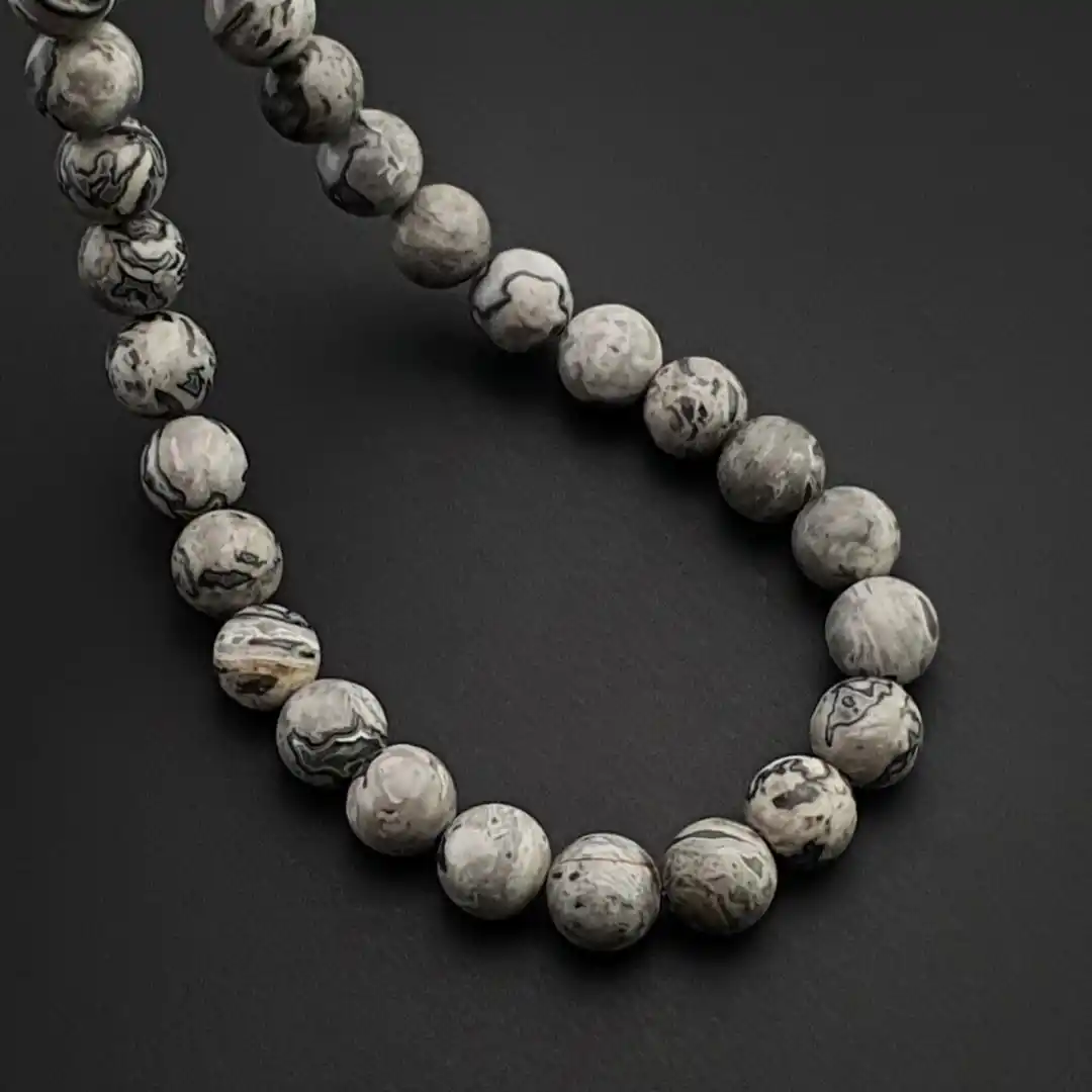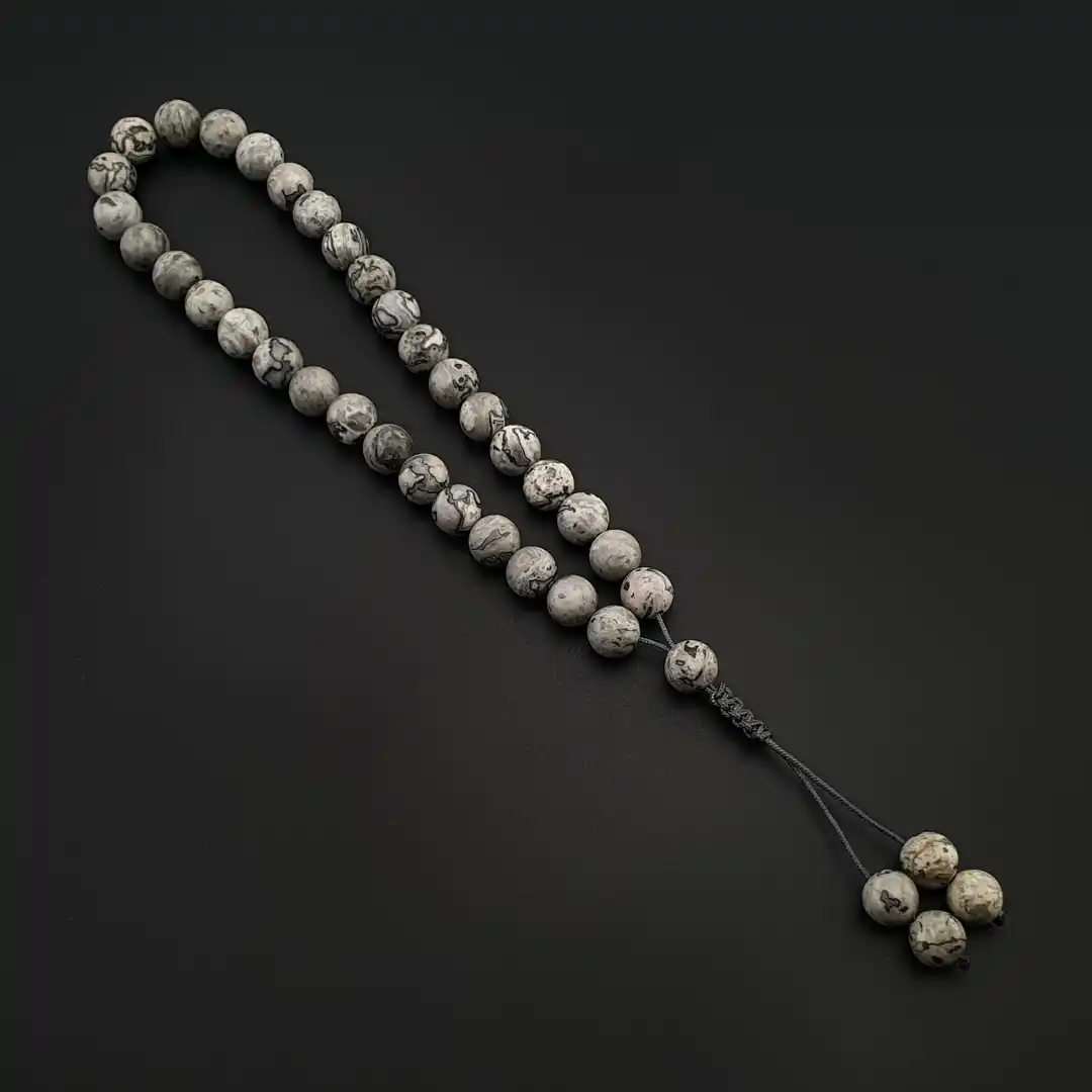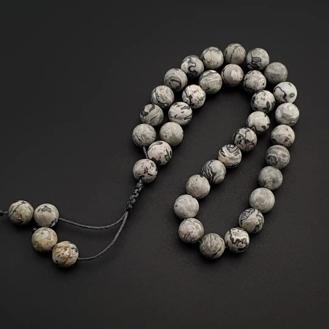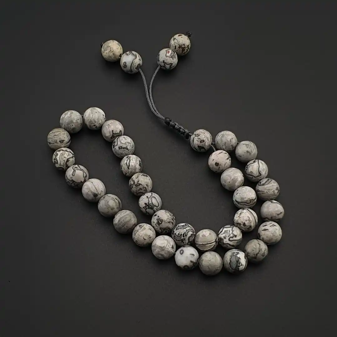 Doğal taş dünyasının en karakteristik ve desen açısından en dikkat çekici taşlarından biri olan Map Jasper (Harita Jasper), yüzeyinde yer alan benzersiz damar yapılarıyla adeta doğanın çizdiği bir haritayı andırır. Açık gri, krem ve siyah tonların iç içe geçtiği bu özel tesbih modeli; sade ama güçlü bir stil arayanlar için özgün bir alternatif sunar.