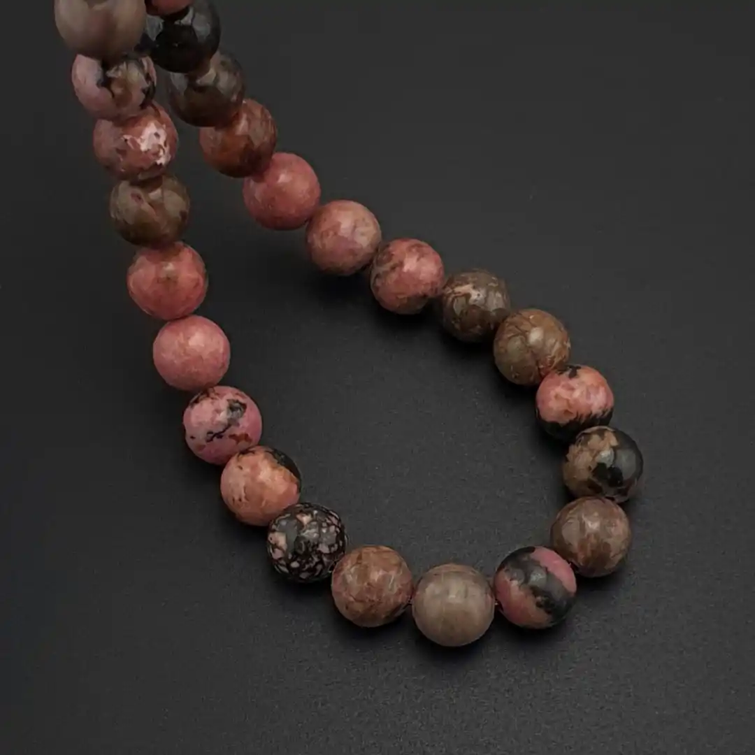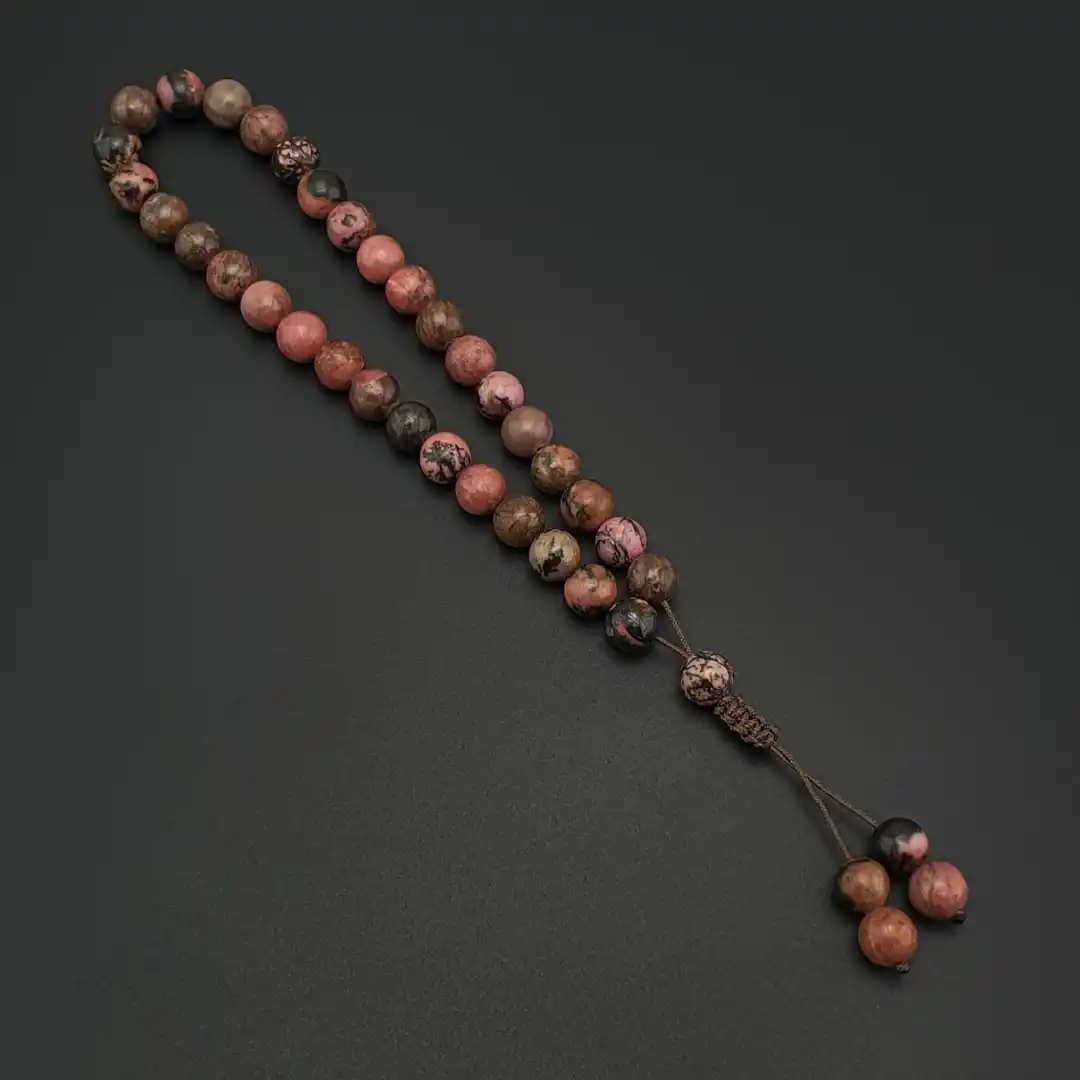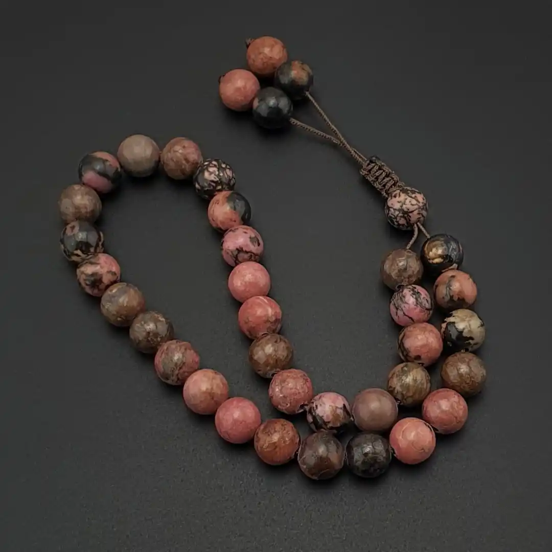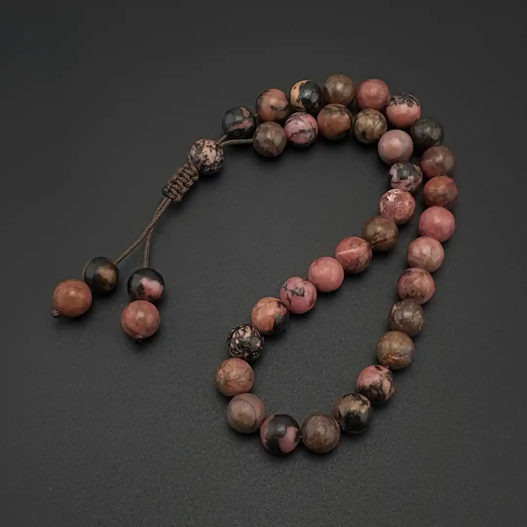 Doğal taş dünyasında pembe ve mercan tonlarıyla öne çıkan Rodokrozit, her tanesinde görülen doğal renk geçişleri ve hafif parlaklığı ile tesbihe estetik bir karakter kazandırır. Taş yüzeyindeki doğal çizgiler ve ton farklılıkları, her bir tesbihe benzersiz bir görünüm sunar.