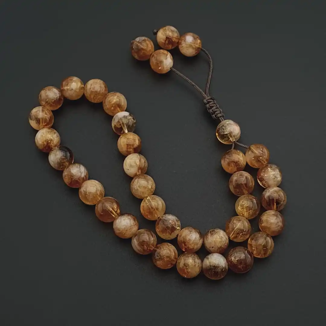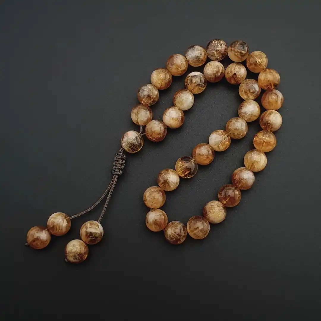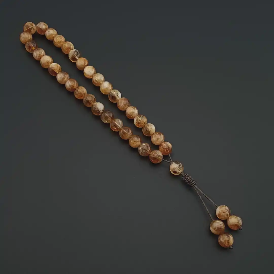 Sitrin taşı; doğal yapısında bulunan altın sarısı ve bal tonlu geçişleriyle bilinir. Her tanede farklı yoğunlukta görülen bu renk dağılımları tesbihin tamamen doğal ve eşsiz olduğunu gösterir.
