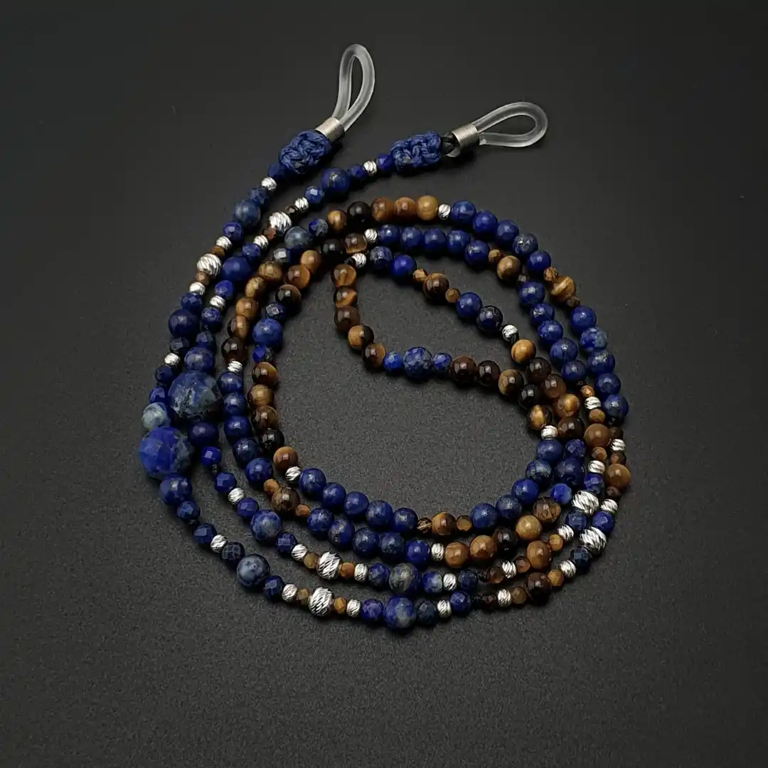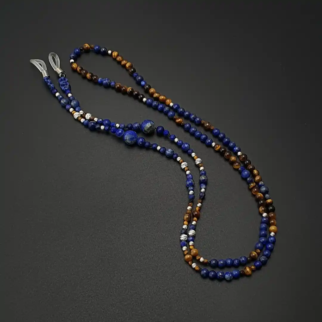 Lapis Lazuli & Kaplan Gözü Doğal Taşlı Gözlük İpi – Gümüş Detaylı El Yapımı Tasarım