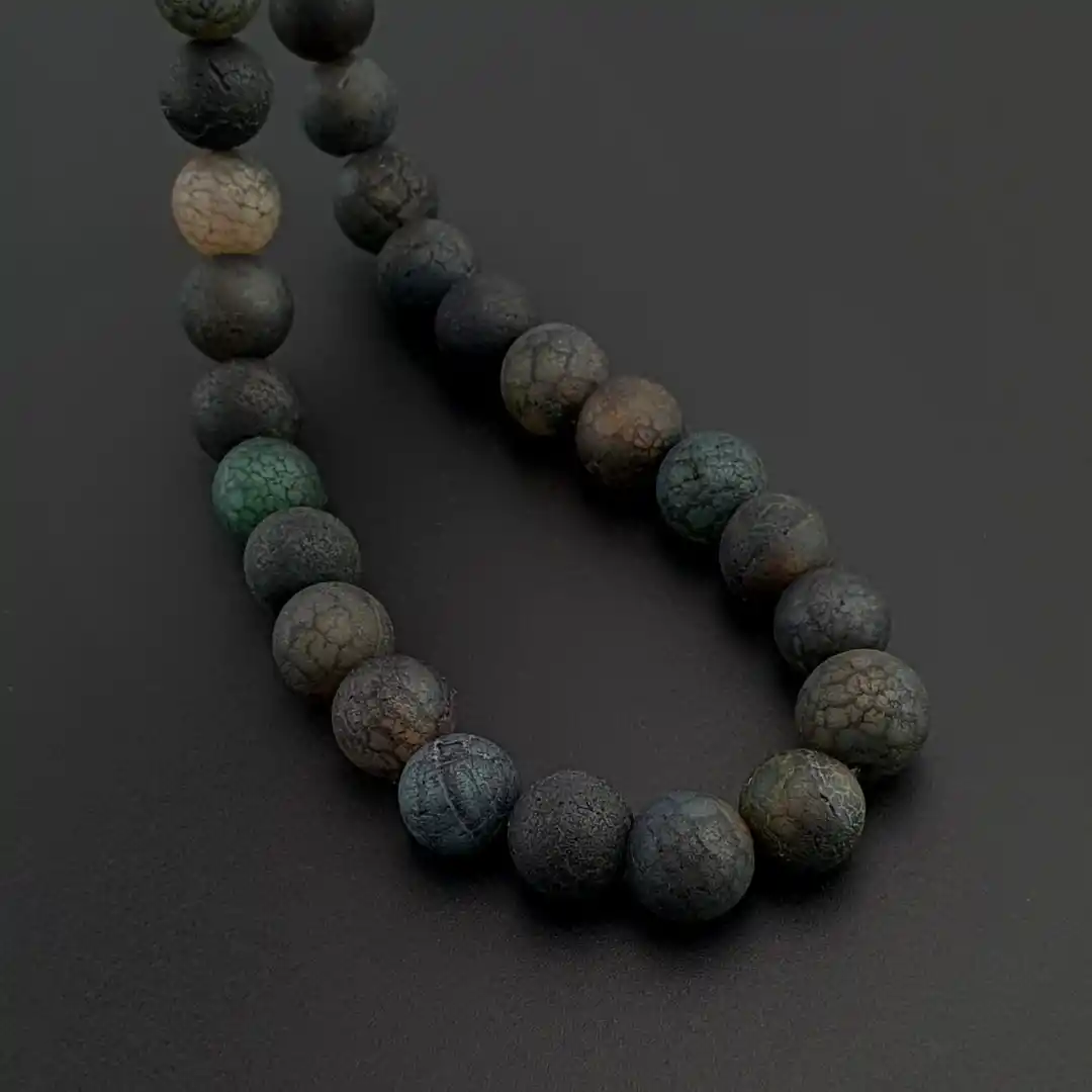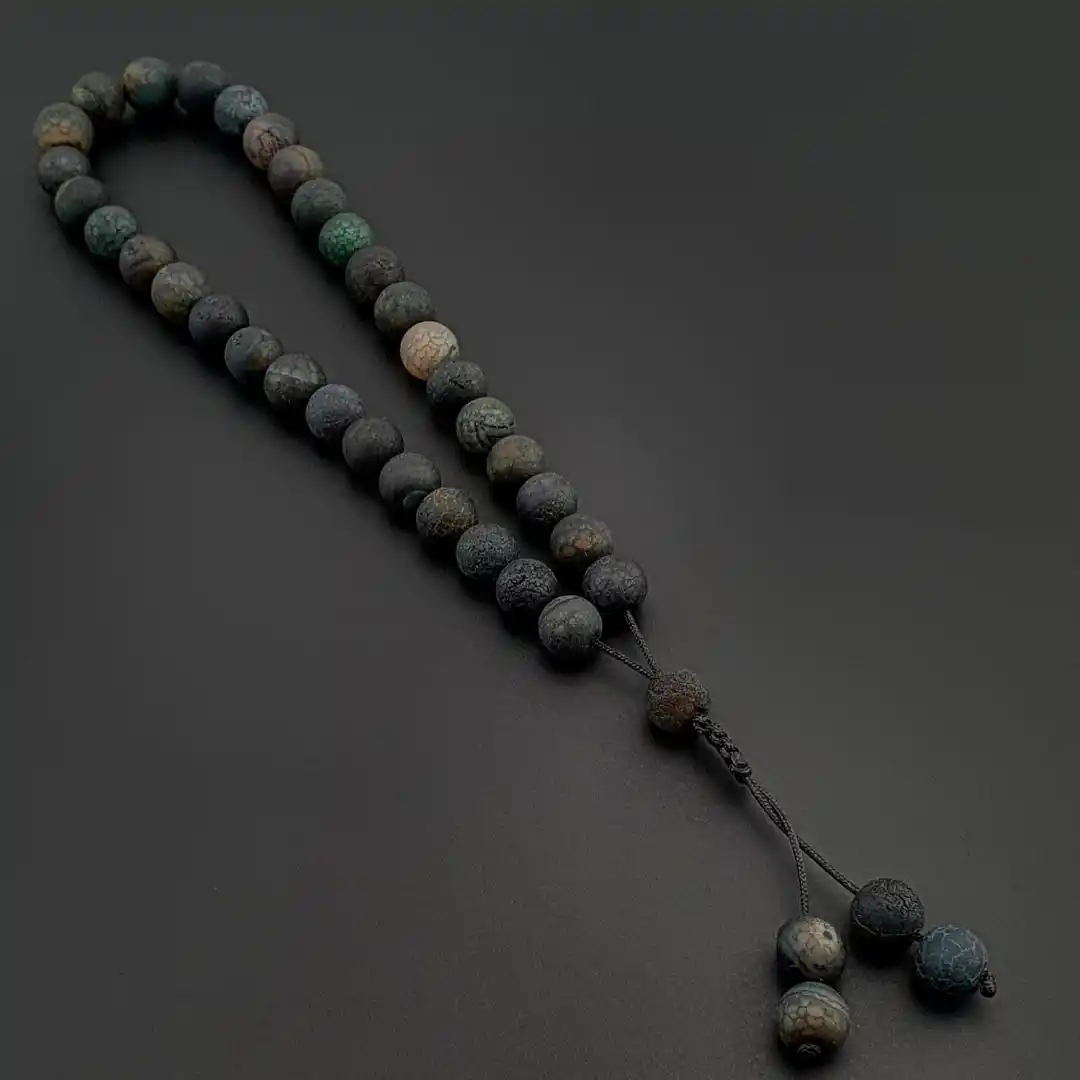 Tibet Akiği taşı; koyu gri, antrasit, yeşilimsi ve yer yer kahverengi ton geçişleriyle bilinir. Taş yüzeyinde görülen doğal çatlak dokular ve eskitme görünümlü desenler, ürüne otantik ve karizmatik bir hava katar. Modern ve maskülen stil ile uyum sağlayan bu tesbih modeli, sade ama güçlü bir aksesuar arayanlar için ideal bir seçenektir.