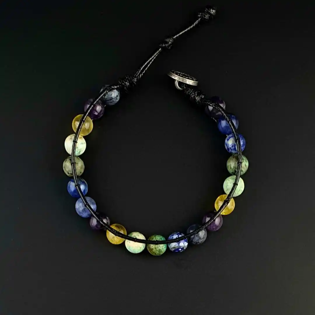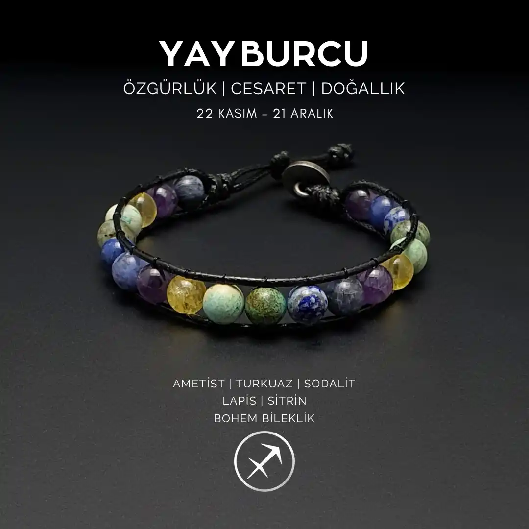 Macera ruhu, keşfetme arzusu ve iyimserliğiyle öne çıkan Yay burcu için özel olarak hazırlanan bu el yapımı bohem bileklik, zarif işçilik ve doğal taşların enerjisiyle bütünleşiyor. Tasarımında yer alan ametist, huzur ve denge getirirken; turkuaz taşı koruyucu etkisiyle özgür ruhu destekler. Sodalit, iletişimi güçlendirip içsel dinginlik sağlarken; lapis lazuli bilgelik ve sezgiyi artırır. Canlılığıyla öne çıkan sitrin taşı ise neşeyi, pozitifliği ve bolluğu simgeler.